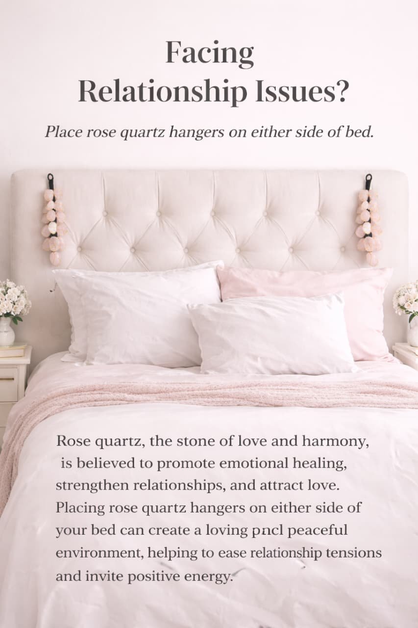 Placing Rose quartz hangers on either side of your bed can create a loving and peaceful environment, helping to ease relationship tensions and invite positive energy.